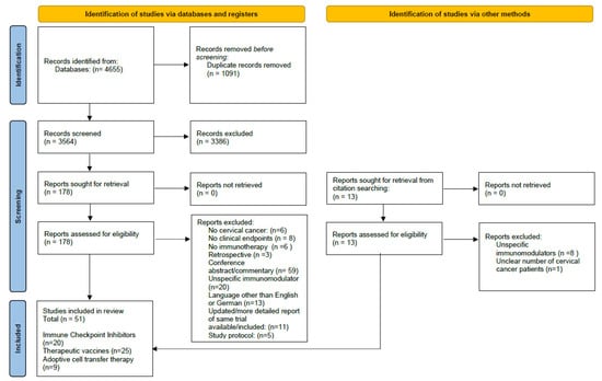 Various nonspecific immune system modulators, including interferon α, interleukin 12, extract derived from agaricus blazei murill kyowa, mycobacterium tuberculosis (Z-100) or streptococcal preparations (OK-432) as well as sizofiran and thymopentin or cornyebacterium parvum have been studied for cervical cancer [74,75,76,77,78,79,80,81,82,83,84,85,86,87,88,89,90,91,92,93,94,95,96,97]. All agents affect the immune system in a general way at different levels. However, probably due to the rise of targeted immunotherapies, only a few large trials assessing nonspecific immune system modulators have been conducted after the year 2000. Unfortunately, the term immunotherapy (including variations of it) was not as commonly used to describe a treatment approach back then, and our search strategies were found to be inappropriate to adequately report the current evidence of nonspecific immune system modulators in this systematic review. Thus, the respective trials were excluded. Nevertheless, a sample of 25 trials can be found in Table S1.