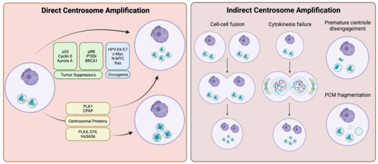 Centrosome amplification may occur directly through molecular changes within the cell such as overexpression of proteins regulating the centrosome cycle, presence of viral oncogenes, etc. (left panel), or indirectly via gross cellular anomalies, such as cellular fusion or premature centriole disengagement (right panel). Created with BioRender.com.