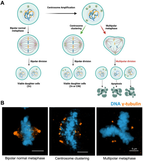 While aneuploidy and CA frequently co-exist in cancer cells [189], having supernumerary centrosomes would appear to be an obstacle to the cell. Extra centrosomes can result in multipolar divisions, likely to lead to the loss of genes essential for the survival of a diploid cell. However, cancer cells are frequently found to be tetraploid, and multipolar division under those circumstances is much more likely to generate not only viable progeny, but also progeny that have advantageous chromosomal rearrangements. [65]. In diploid cells, CA-induced multipolarity will lead to non-viability, but clustering of the extra centrosomes into a bipolar spindle allows proliferation to continue. These clustered spindles maintain the proliferative cycle longer while also serving as the primary mechanism by which CIN and aneuploidy can be induced [190].