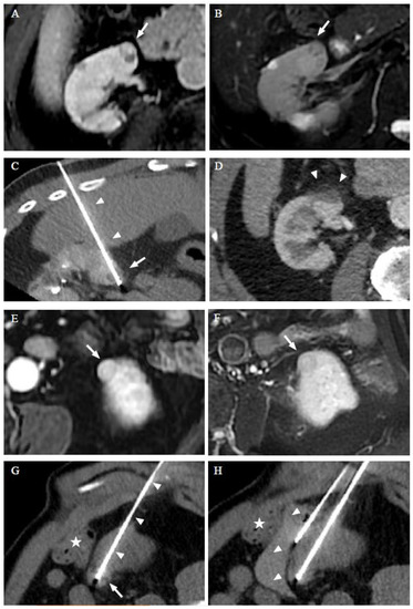 RFA of a 68-year-old man with Birt–Hogg–Dubé syndrome who had a history of partial nephrectomy and presents two ccRCCs treated in two separate sessions. Dynamic axial T1w sequences with fat suppression after gadolinium injection (A) and axial T2w image with fat saturation (B) show the first ccRCC (arrow) treated. Computed tomography (CT) images in the axial plane obtained during the RFA show the transhepatic probe (arrowheads) into the lesion (arrow) (C). CT images in the axial plane on the follow-up 6 months later show a RFA scar (arrow) (D). Dynamic axial T1w sequences with fat suppression after gadolinium injection (E) and axial T2w image with fant saturation (F) show the second ccRCC (arrow) developed in the left kidney 26 months after the initial RFA session. CT images in the axial plane obtained during the 2nd session of RFA show the RFA probe (arrowheads) into two of the lesions (G), and hydrodissection with 60 cc of serum glucose 30% was performed to protect the colon (star) (H). The patient was alive with no local progression or distant metastasis 33 months after the initial thermal ablation.