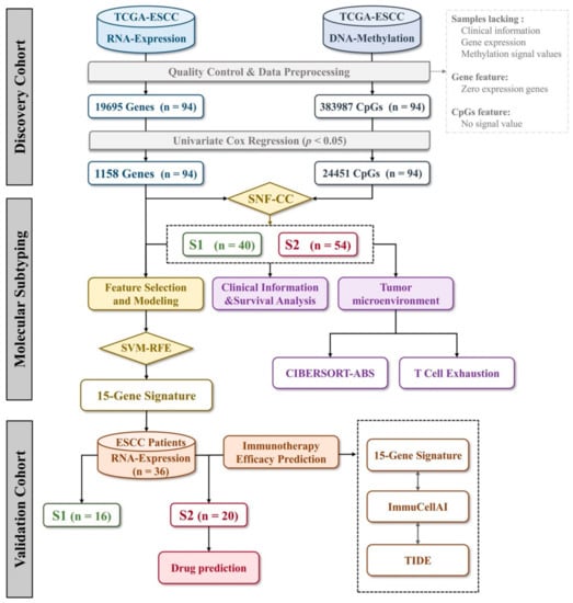 The legacy archive information of clinical and transcriptomic data of 94 ESCC patients from The Cancer Genome Atlas project (TCGA cohort) were retrieved using R package TCGAbiolinks (version 2.16.4) from the Genomic Data Commons (GDC) Data platform. The obtained transcriptomic data in RSEM format were normalized by Z-score and Log2 transformation. DNA methylation data profiled with Illumina Human Methylation 450 microarray were downloaded from the UCSC Xena browser (https://xenabrowser.net/, accessed on 21 January 2022). The DNA methylation levels (as beta values) were normalized by Z-score transformation. The gene expression data and DNA methylation data were normalized using the data.normalization function of the R package CancerSubtypes (version 1.14.0). Noninformative genes and CpG sites with zero variance cross samples were excluded.