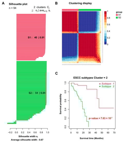 Previous study suggested that both methylation and expression profiles contribute significantly and differently to define tumor molecular subtypes []. Two data types provide distinct but complementary signals that improve over single-modality analyses. Therefore, an integrated approach that allows a unified view of the underlying groups would be valuable in elucidating heterogeneity within subgroups. Herein, we conducted the Similar Network Fusion and Consensus Clustering (SNF-CC) analysis on 94 ESCC samples using both gene expression and DNA methylation data. We combined the matrix of 1158 genes’ expression data and 24,451 CpGs’ methylation data for integrative analysis. The ExecuteSNF.CC function implanted in R package CancerSubtypes (version 1.14.0) was used to run SNF-CC analysis. The following detailed parameters were designed to ensure a compromise between high stability and low ambiguity: clusterNum = 2~10, K = 20, alpha = 0.5, t = 20, maxK = 10, pItem = 0.8 and reps = 500. The appropriate number of clusters was selected by the ‘estimateNumberOfClustersGivenGraph’ function implanted in R package SNFtool (version 2.3.1) []. Moreover, we use a similarity matrix to calculate the silhouette width, which indicates how closely a specimen is matched to its recognized subtype when compared to other subtypes.