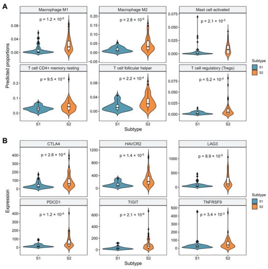 Owing to the prognostic significance of molecular subtypes, we speculated that two subtypes might be relative to immune activities and tumor microenvironment (TME). We applied the CIBERSORT ABS algorithm to assess the abundance of 22 distinct immune cell types for each sample and between two molecular subgroups. As shown in Figure 3A, the high-risk group (S2 subtype) exhibited increased predicted proportions of regulatory T cells (Tregs), T cell CD4+ memory resting, T cell follicular helper, macrophages and activated mast cells (Wilcoxon p-value < 0.01). Previous studies have proved that Tregs might hasten the development of ESCC, and both Tregs and macrophages were relevant to poor prognosis in ESCC patients [,,]. Similarly, it has been reported that high mast cell density is a predictor of poor survival in ESCC patients []. Effector T cells in the TME are inclined to high expression levels of numerous inhibitory receptors, including PD-1, Hepatitis A Virus Cellular Receptor 2 (HAVCR2, also known as TIM3), T cell immunoreceptor with Ig and ITIM domains (TIGIT) and lymphocyte activating 3 (LAG3), which are considered to be symptoms of a dysfunctional state, well recognized as T cell exhaustion []. We, therefore, sought to further investigate the relationship between the molecular subtypes and the mRNA expression levels of multiple inhibitory receptors. Interestingly, we observed several inhibitory receptors, including CTLA4, LAG3, PDCD1, HAVCR2, TIGIT and TNFRSF9, were significantly upregulated in patients of the high-risk group (Two-sample t-test p-value < 0.05, Figure 3B). These findings suggest that poorer outcomes for the high-risk group (S2 subtype) might be partially caused by the immunosuppressive microenvironment and high T cell exhaustion. Because T cells are the direct target for several immunotherapies, high T cell exhaustion may also influence the S2 subtype patients’ response to antitumor immunotherapies.