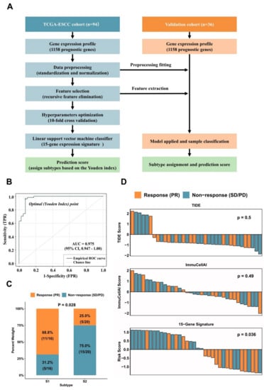 To validate the performance of the established model in a clinical setting, we collected 36 Chinese ESCC patients who had received anti-PD-1/PD-L1 therapy in combination with chemotherapy between January 2018 and December 2020 from The First Affiliated Hospital, School of Medicine, Zhejiang University. All patients had histologically confirmed esophageal squamous cell carcinoma and had measurable disease. All tumor samples were classified based on the American Joint Committee on Cancer (AJCC) tumor-node-metastasis (TNM) system (7 edition). According to Response Evaluation Criteria in Solid Tumors (RECIST, version 1.1), imaging studies were used to gauge the tumor response. Patients were classified as either responder if they had a complete response (CR) or partial response (PR) or non-responders if they had stable (SD) or progressive disease (PD) []. Detailed clinical information on age, gender, smoke, alcohol, histopathological factors and anti-tumor treatments was obtained from the medical records. This study was approved by the Institutional Review Board of The First Affiliated Hospital, School of Medicine, Zhejiang University (2022-346) in concordance with the Declaration of Helsinki.