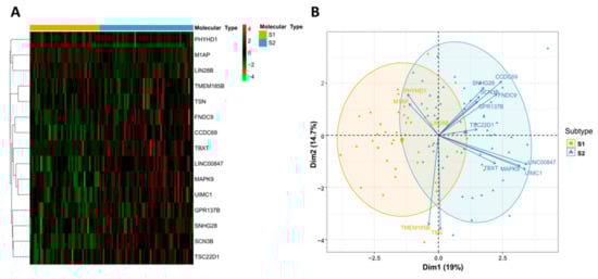 (A) Hierarchical clustering analysis of 15 genes in two subtypes. (B) Principal component analysis of 15 genes between two subtypes.
