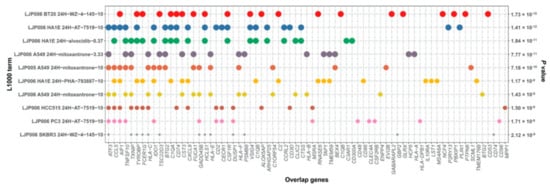 Bubble plot showing the distribution of the genes for each LINCS L1000 Chem Pert category. The color of the bubbles represents the L1000 term, and the size of the bubbles indicates the p-value of the terms.