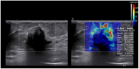 Shear-wave elastography (SWE) is an ultrasound (US) technique that can quantitatively measure the stiffness of a target lesion in kilopascals (kPa) in vivo []. SWE is now widely used in patients with breast masses for the differentiation of benign and malignant lesions []. Malignant breast lesions usually have higher elasticity values than benign breast lesions, and invasive carcinoma has an even higher elasticity value than carcinoma in situ []. Among several quantitative SWE measurements (mean, maximal, and minimal), maximal elasticity is known to be well correlated with lesion stiffness [].
