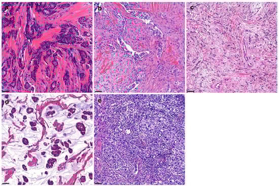 Variable tumor stroma types of breast cancer. The tumor stroma can be variably present. In this study, the stroma was divided into collagenous (a) and non-collagenous (b–e) types. The collagenous stroma is characterized by dense, pinkish, cellular collagenous fibrosis (a). Non-collagenous stroma includes stroma with mesenchymal cellular components (b), loose and sparse cellular components (c), mucinous components (d), or inflammatory components (e).