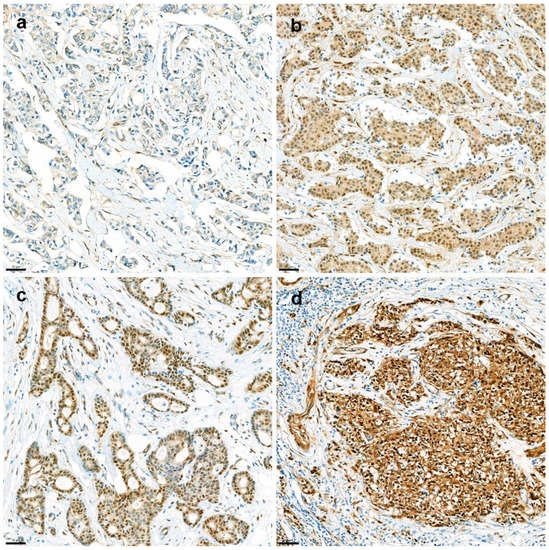 H&E slides from resected breast cancer specimens were reviewed, and one representative whole slide was selected for further YAP1 IHC. Briefly, 3-µm thick tissue sections were cut from the FFPE tissue block of the most representative section. After deparaffinization and rehydration with graded xylene and alcohol solutions, IHC was performed using a Ventana Discovery XT Automated Slide Stainer (Ventana Medical System, Tucson, AZ, USA). Cell conditioning 1 (CC1) buffer (citrate buffer, pH 6.0; Ventana Medical System) was used for antigen retrieval. Appropriate positive and negative controls were included in this study. Whole tissue slides were stained with an anti-YAP1 antibody (clone 63.7; dilution 1:200; Santa Cruz Biotechnology, Dallas, TX, USA). After staining, nuclear YAP1 expression was assessed by two breast pathologists (YL and YJC; 400× magnification). YAP1 expression was evaluated in the nuclei of the tumor cells. Nuclear staining was evaluated by the H-score, which was obtained by multiplying the staining intensity (0, 1, 2, or 3) by the percentage of stained area (%). The intensity of nuclear staining of myoepithelial cells was assigned a value of 2+ and used as an internal control. Weaker and stronger signals were assigned the values of 1+ and 3+, respectively. (Figure 3). For further analysis, an H-score of 20 was applied as the cutoff to determine the YAP1-negative and YAP1-positive groups. IHC results were interpreted blindly, without any information regarding clinical parameters or outcomes.