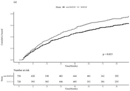 The PS was calculated using a logistic regression model based on age, sex, LC, metformin use, statin use, AVT, smoking history, alcohol consumption, and physical activity. After performing PSM with absolute standardized mean differences below 0.1 for all variables (Supplementary Figure S2), 720 pairs of patients were included in the analysis. According to the baseline characteristics of the MAFLD and non-MAFLD groups in the matched cohort, there was no significant difference between the two groups, except for hypertension and diabetes (all p > 0.05; Supplementary Table S4). The MAFLD group had significantly higher 1-, 3-, and 5-year cumulative incidences of HCC recurrence in the matched cohort than the non-MAFLD group [17.0%, 37.4%, and 46.8% in the MAFLD group vs. 14.2%, 31.9%, and 40.2% in the non-MAFLD group; p = 0.015)] (Figure 2a). The MAFLD group also had significantly higher 1, 3, and 5-year cumulative incidences of all-cause mortality than the non-MAFLD group [4.2%, 12.2%, and 18.5% in the MAFD group vs. 2.9%, 8.6%, and 12.8% in the non-MAFLD group; p < 0.001] (Figure 2b).