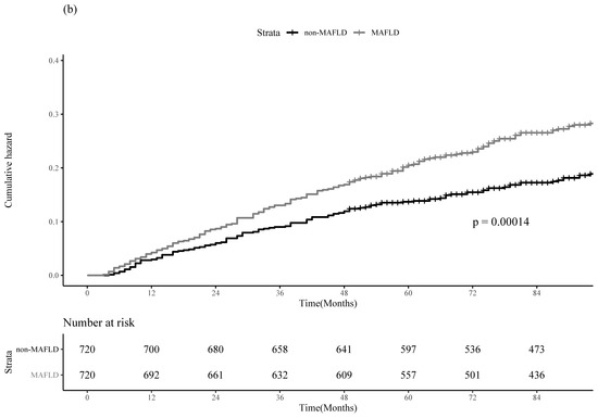 The MAFLD group had significantly higher incidence of 1-, 3-, and 5-year HCC recurrence than the non-MAFLD group [17.0%, 37.2%, and 46.4% in the MAFLD group vs. 13.9%, 31.2%, and 39.6% in the non-MAFLD group, respectively; p = 0.002)] (Figure 1a). The MAFLD group also had significantly higher incidence of 1-, 3-, and 5-year all-cause mortality than the non-MAFLD group [3.7%, 11.4%, and 17.2% in the MAFLD group vs. 2.8%, 8.9%, and 13.0% in the non-MAFLD group, respectively; p < 0.001] (Figure 1b). The HRs (95% CIs) of HCC recurrence and all-cause mortality by MAFLD were 1.22 (1.07–1.38; p = 0.003) and 1.44 (1.19–1.75; p < 0.001), respectively.