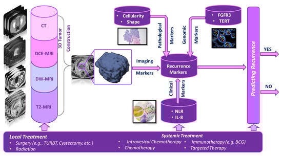 The studies included in Table 1 were only concerned with differentiating recurrent NMIBC from other tissues and did not explore the power of radiomic markers as predictors of recurrence after initial treatment. To date, no AI algorithms have used only radiomic markers as the input. The four studies used the MRI signal intensity or FDG uptake on PET-CT as the most significant marker, with an accuracy ranging from 0.915 to 0.926 and from 0.886 to 0.90, respectively. Moreover, these were retrospective studies with a small number of patients. Additional markers that have the potential to improve prediction performance are illustrated below.