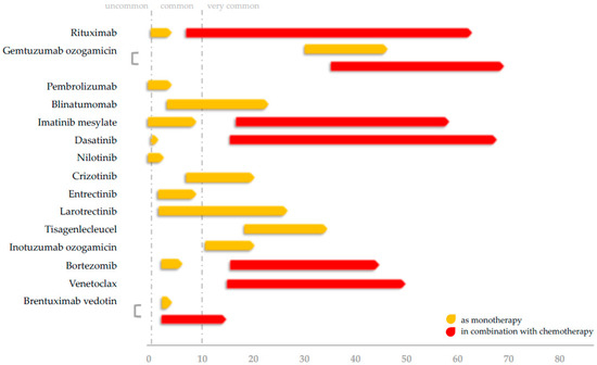 Despite improvement in the overall cure rates of childhood leukemias and lymphomas, outcomes following conventional chemotherapy and HSCT have reached a plateau. Refractory and relapsing (r/r) disease is still a major problem, along with treatment-related toxicity. Beyond genetic alterations, precision medicine features, such as immunophenotype, drug response, and residual disease, allow better stratification and prognostication of the disease and offer new insights into therapeutics through the implementation of targeted therapies [1,2]. Targeted therapies differ from conventional cytotoxic therapies in their specificity towards targeted pathways, that can compromise the growth and survival advantage of cancer cells rather than damaging indiscriminately all rapidly dividing or irradiated cells. Targeted therapies comprise biologics (mainly monoclonal antibodies or mAbs) and small-molecule drugs, and they have evolved significantly since their first members were initially approved for the treatment of blood cancer (rituximab in 1997 and imatinib in 2001, respectively). Not until the last decade, pediatricians and hematologists have gained considerable experience with their use in the pediatric setting, although their use is still not widespread. While most of these agents seem to be generally well tolerated and safe, prompt monitoring for the recognition and treatment of infectious complications should be conducted. Nevertheless, the assessment of the exact contribution of targeted therapies to infection rates in children with hematologic malignancies is problematic, as their immune system is compromised because of their disease and the prior use of conventional chemotherapy. Additionally, preceding and concomitant immunosuppressive treatments also affect the infection rates observed [3,4]. The aim of this review is to summarize and update our current knowledge of the infectious complications following molecularly targeted therapies and immunotherapy in the context of treating childhood leukemias and lymphomas. The mechanisms by which these agents affect the immune system are scrutinized and pooled analyses of results are presented where applicable. Table 1 describes all relevant Food and Drug Administration (FDA) and European Medicines Agency (EMA) approved targeted therapies for pediatric patients.