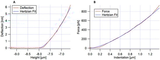 Representation of an example of the approach of a conventional force–distance curve. (A) Approach curve (cantilever deflection versus the height piezo), with Hertz’s fitting; (B) Hertz’s fitting of the force versus indentation of the sample.