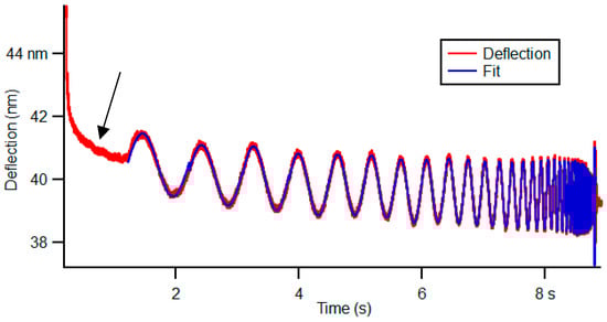 A representative of the deflection signal versus time during dwell, i.e., while the tip is in contact for 8.7 s, during frequency sweep. The first region of red curve (identified by the black arrow) presents the sample creep after loading the cell during the approach. This stress relaxation of the cell was not analyzed. The analysis of the curve starts with the curve fitting (blue color).