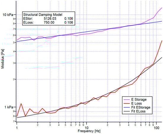 An example of the loss and storage modulus versus frequency obtained by the frequency sweep. A power-law fit is applied to the storage modulus, whereas the structural damping model is used to fit the loss modulus. Both fit procedures result in a storage and loss modulus value for the lowest frequency (here, 1 Hz). Presently, 5126 Pa and 750 Pa are shown, respectively, and a power-law exponent of 0.106.