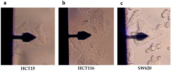 To assess the mechanical properties of the CRC cell lines, cell clusters of adherent HCT15, HCT116, and SW620 cells were chosen (Figure 4). The quantification of mechanical properties was performed using conventional force–distance curve acquisition and frequency sweep.