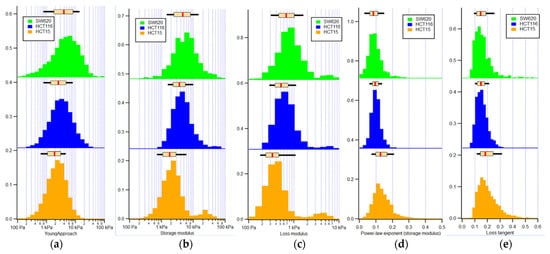 Histograms of mechanical properties quantification of the three CRC cell lines: (a) apparent Young’s modulus; (b) storage modulus; (c) loss modulus; (d) power-law exponent of the storage modulus; and (e) loss tangent. The boxplot above the histograms presents the median (red line) and the 25th and 75th percentiles (extent of rectangle in cream color), as well as the 10th and 90th percentiles (black lines extending beyond the box), respectively. Orange: HCT15, blue: HCT116, and green: SW620 cells.