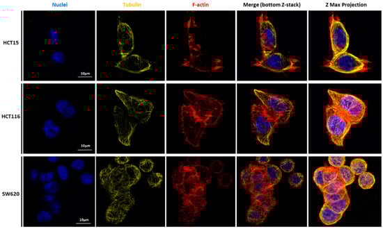 Expression of tubulin and F-actin in CRC cells. Staining of HCT15 (top), HCT116 (middle), and SW620 (lower images) cells for DAPI to localize the nuclei (blue), tubulin (yellow), and phalloidin to detect F-actin filaments (red). The bottom Z-stack is shown, and a Z-maximum projection of each condition is also depicted (right panels). Scale bars: 10 µm.