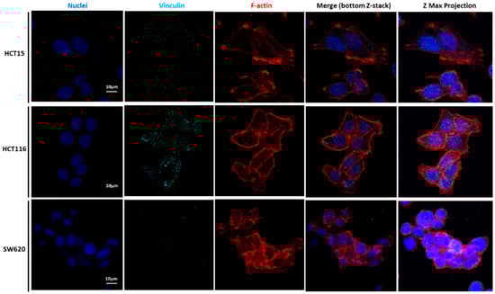 Vinculin expression in CRC cell lines HCT15 (top), HCT116 (middle), and SW620 (lower images) immunostained for DAPI to illustrate the nuclei (blue), vinculin (cyan), and phalloidin for F-actin filaments (red). The bottom Z-stack micrograph is shown, and a Z-maximum projection showing the overall stains is also represented (right panels). Scale bars: 10 µm.