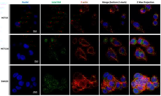 Immunolocalization of FAK in CRC cells. Staining of HCT15 (top), HCT116 (middle), and SW620 (lower images) cells with DAPI to identify the nuclei (blue), phosphorylated FAK (green), and phalloidin for F-actin filaments (red). Shown are the bottom Z-stack and the Z-maximum projection of the imaged area. Scale bars: 10 µm.