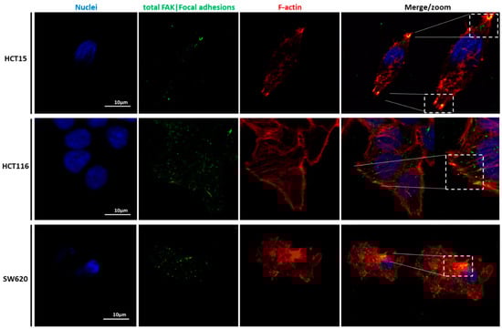 Illustration of the focal adhesion sites of CRC cells seeded in 2D. Immunolocalization of nuclei (blue), phosphorylated FAK (green), and F-actin filaments (red) in HCT15 (top), HCT116 (middle), and SW620 (lower images) cell lines. The zoomed areas indicate the co-localization of FAK with the F-actin filaments at the focal adhesion complexes located at the bottom z-stack. Scale bars: 10 µm.