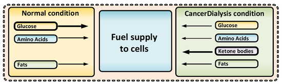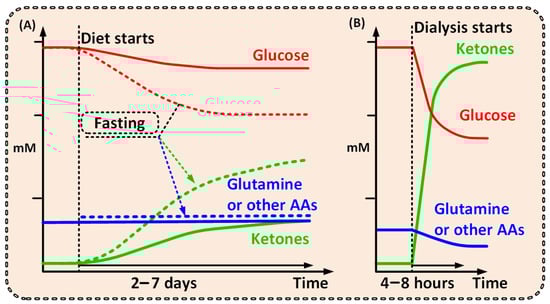 With the exception of lipids, all metabolic fuels in the human blood such as glucose, ketone bodies (KB), lactate, and amino acids (AAs), are small water-soluble substances that can be readily exchanged during dialysis. With dialysis, glucose [22] and glutamine [21] levels will be reduced, and simultaneous addition of KB (orally, intravenously, or by adding them to the dialysis fluid), could increase KB levels within a range of 2–8 mmol/L in blood [30] within one to two hours. Notably, ketoacidosis is a serious side effect of ketogenesis (not the presence of KB per se) that mainly occurs in type 1 diabetes. Ketoacidosis will not be induced when external KB is supplied [31]—thus avoiding this unwanted side effect.