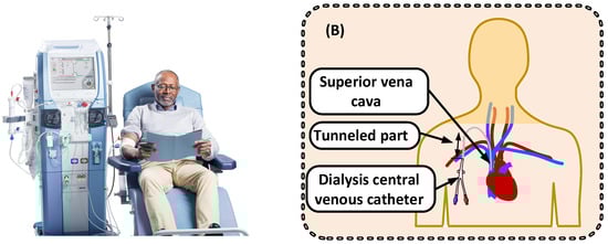 Chronic kidney disease affects one in ten people globally, of which about one percent require kidney replacement therapy (KRT) in the form of dialysis or kidney transplantation. Institutional hemodialysis (Figure 3A) remains the most common form of KRT and is typically given as four-hour treatments in-hospital thrice weekly. Blood is supplied to an extracorporeal circuit from either a central dialysis catheter or an arteriovenous fistula and is pumped at a rate of 200–400 mL/min to a dialyzer composed of a blood compartment and a dialysis fluid compartment separated by a semi-permeable membrane. The fresh dialysis fluid is mixed in a dialysis machine with water and chemicals in dry or liquid form to concentrations desired for the patient’s blood. In many parts of the world, glucose is added to the dialysis fluid to avoid hypoglycemia, especially in diabetic patients [42,43,44,45]. The dialysis fluid flow is typically twice the blood flow. Metabolic waste solutes are transferred from the blood to the dialysis fluid across the membrane mainly via diffusion.