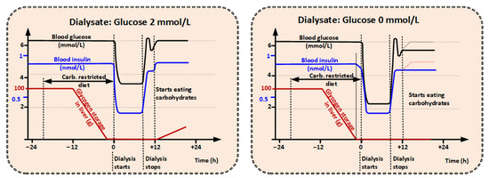 In order to achieve a starvation-like metabolic state with dialysis, a carbohydrate-restricted diet would be required 12 to 18 h before a glucose free dialysis treatment starts [49,50]. However, other sources of energy are encouraged, and patients could even receive appropriate parenteral nutrition to compensate for glucose and amino acid loss during the carbohydrate-restricted diet and the succeeding dialysis treatment. The goal of dialysis therapy is to mimic the metabolic condition after that of prolonged fasting for weeks or following long-endurance exercise (many hours).