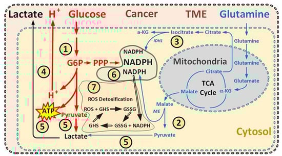 Glutamine, which fuels several fermentable pathways, is also important in malignant cells and can lead to the production of lactate, which in turn is exported to the TME and generates NADPH through malic enzyme; also, the isocitrate dehydrogenase enzyme can contribute to lactate production in cancer cells, increasingly important for cancer cells during glucose deprivation [23,71,72,73].