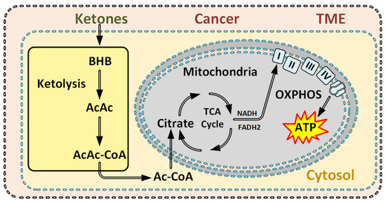 Healthy cells can effectively use ketones as a metabolic energy fuel when they utilize oxygen and the mitochondria for ATP production [28,89]. This ability to use oxygen and the mitochondria for ATP production seems to be limited in cancer cells [28,39,89,90].