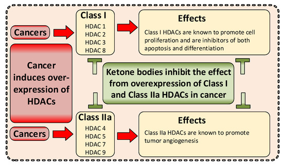 Mikamin et al. found that beta-hydroxybutyrate (the most abundant KB) significantly enhanced cisplatin-induced apoptosis in liver hepatocellular (HepG2) cells, via HDAC silencing through enhanced cisplatin-induced apoptosis via inhibition/surviving axis [8]. Lee et al. found that inhibition of HDACs 3 and 6 had similar effects in breast cancer cells [130]. The reduction of HDAC overexpression may therefore further augment radio- and chemotherapy treatments intended to increase ROS in cancer [8,129]—or immunotherapies to induce immunological responses in cancers [121,122,124].