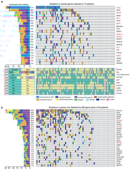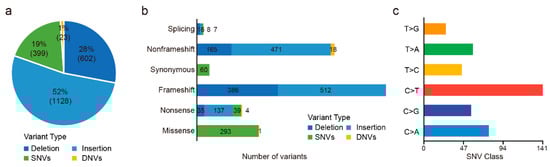Of these 72 patients, 63 were tested for 688 genes and nine were tested for 508 genes. There were a total of 850 targeted genes captured by 688- and 508-gene panels, including 345 shared genes, 343 genes specific in the 688-gene panel, and 163 genes specific in the 508-gene panel. In total, we detected 2152 somatic mutations in 56 (77.78%, 56/72) patients (Table S3), including 399 SNVs, 23 DNVs, 1128 insertions, and 602 deletions (Figure 1a,b). C > T and C > A alteration were the major mutant forms (Figure 1c). In addition, there were 60 synonymous mutations, which we filtered in the following analysis.
