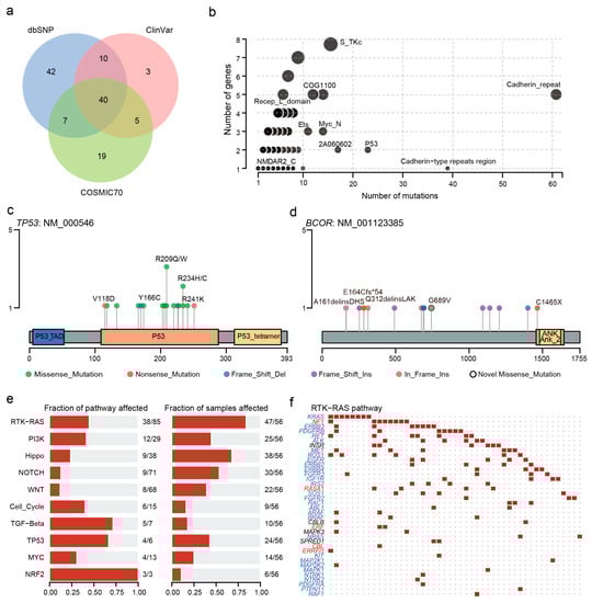 Clinical implications of mutations and domain and pathway enrichment analysis. (a) Venn plot of database-registered variants. (b) Frequently mutated pfam protein domains in CCA. The size of the bubble is in proportion to the number of genes containing prominent display domains. (c) Location of TP53 mutations schematic. (d) Location of the BCOR mutations schematic. (e) Enrichment of known oncogenic signaling pathways. (f) Mutated genes in the RTK-RAS pathway. Tumor suppressor genes are in red, and oncogenes are in blue font. The red square represents a patient with one or more mutations in this gene and the black dot represents no mutation detected in the patient.