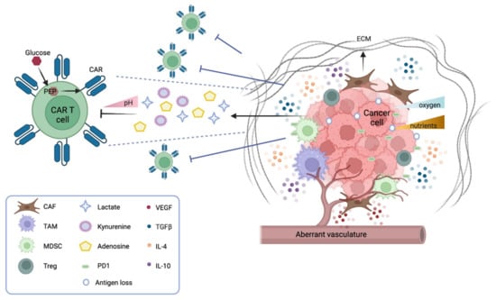 The TME is replete with soluble factors released by both tumor and immune cells. Most of them have direct suppressive roles in CAR T-cell-driven adoptive immunotherapy. Most of these factors have a direct suppressive role on CAR T cell adoptive immunotherapy. For example, adenosine is an immunosuppressive metabolite secreted by tumor and immune cells in the TME. In melanoma models, antagonists of the adenosine 2a receptor strongly increase the efficacy of CAR T therapy, either alone or in combination with a PD-1 checkpoint blockade [24]. Another inhibitory factor is prostaglandin E2 (PGE2), an inflammatory molecule generated by tumor cells and macrophages that impairs CD4+ T cell proliferation and CD8+ T cell differentiation [25]. Both PGE2 and adenosine exert their immunosuppressive function by activating protein kinase A (PKA), which inhibits TCR signaling. Newick et al. engineered CAR T cells to express a PKA inhibitor peptide, and showed that these armored CAR T cells had improved TCR signaling, cytokine production, and enhanced tumor killing [26].
