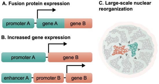 The mere rearrangement of chromosome parts can cause significant consequences in the cell. Chromosomal translocations have been linked to aneuploidy, infertility, mental retardation, cancer, and other diseases [17,18,19,20,21,22]. Chromosomal translocations may result in the formation of fusion proteins (Figure 2A) with unique or atypical functions or activity, as in the case of the BCR-ABL fusion protein in CML [23,24,25]. In addition, they can result in the aberrant expression (upregulation or downregulation) of an otherwise normal gene if it is positioned next to the new cis-regulatory elements (Figure 2B). Usually these aberrantly expressed genes are proto-oncogenes that are controlled by a potent gene promoter or enhancer after the translocation. Either of these two can significantly affect the cell and can lead to its transformation and malignancy. This is exemplified by Burkitt’s lymphoma, where the MYC gene on chromosome 8 is translocated next to the IGH locus on chromosome 14; this triggers its overexpression [26,27,28,29,30]. Recently, large-scale changes in the nuclear organization have also been attributed to chromosomal translocations, further expanding our understanding of the consequences of chromosomal translocations for the cell [11,31,32,33,34,35,36].
