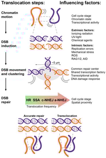 The erroneous repair of DSBs on different non-homologous chromosomes can result in their joining; this mechanism of chromosomal translocation generation largely relies on the spatial proximity of DNA ends. However, whether the potential translocation partners should be initially proximally close when the breaks occur or they can move in the nuclear space after the break to get closer is still an open question. In this regard, the “contact first” and “break first” models of translocation formation have been proposed, which assume that the movement of intact chromatin or the movement of DSBs, respectively, contribute to the eventual proximity of DNA ends and translocation [3,75,91,92].