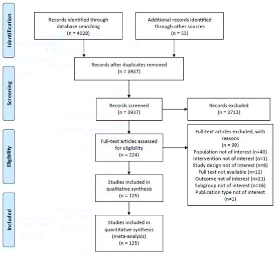 A primary search of the databases retrieved 4028 studies. After the duplicates were removed, 3937 unique studies were screened, including 53 studies from a bibliographic search in determining whether the inclusion criteria, as described in the methodology section, had been met. It was found that 3713 studies were not related to the study topic or met one of the exclusion criteria. Two hundred and twenty-four studies were further assessed for eligibility through a full text examination, and 99 were excluded for not meeting the inclusion criteria. Finally, one hundred and twenty-five studies met the pre-defined eligibility criteria. The reasons for the exclusion of each study are shown in Figure 1. The list of articles that are excluded at the FPS level (n = 99) due to various reasons is presented in Supplementary Table S2.
