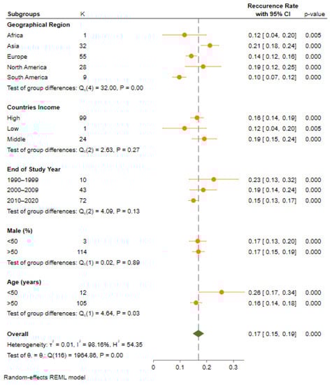 A total of one-hundred and seventeen studies reporting age wise data showed a notable change in the prevalence of HCC after an LT ranging from 16% (95% CI: 14–18, p = 0.000) in the population group with an age >50 years to 26% (95% CI: 17–34, p = 0.000) in the population group with an age <50 years. The majority of the studies published included patients >50 years. When comparing the subgroups of the population age groups with >50 years and <50 years, a significant heterogeneity variation was observed in the prevalence of a recurrent HCC (Q = 4.64, df = 1; p = 0.03).