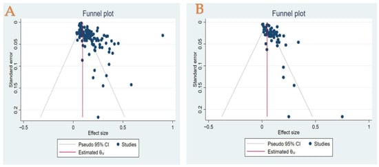 (A) Funnel plot of prevalence off recurrence rate in patients with HCC who underwent LT treatment. (B) Funnel plot of prevalence of mortality due to recurrence in patients with HCC who underwent LT treatment.