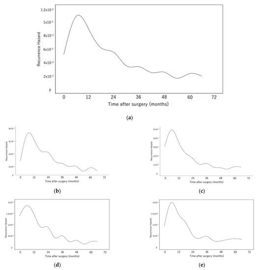 (a) The monthly recurrence hazard function of the entire patient population. The major peak of recurrence was 9 months after surgery. (b–e) The recurrence hazard functions for intrathoracic recurrence (b), extrathoracic recurrence (c), bone metastasis (d), and brain metastasis (e).
