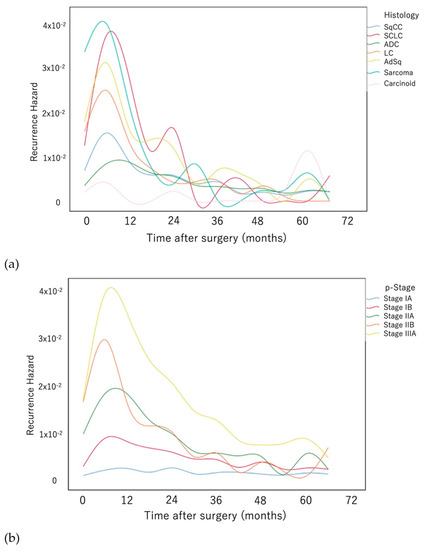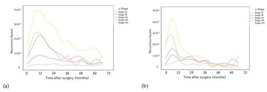 Comparison of the recurrence hazard functions of patients with (a) adenocarcinoma and (b) squamous cell carcinoma at each pathological stage.