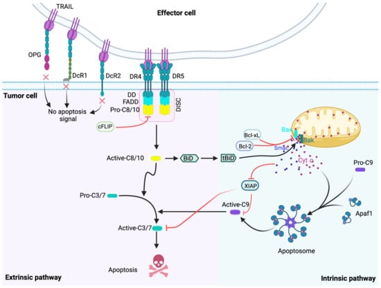 The TRAIL-induced cell death pathway and its regulation. Interaction of TRAIL with DR4 and DR5 leads to the recruitment of the adaptor protein, FADD, which then binds pro-caspase-8 and/or -10 leading to their activation. Activated caspase-8/-10 are released from the DISC into the cytoplasm, where they activate the downstream, effector caspases, which by cleaving vital proteins commit the cell to die. Caspase-8 can also cleave the BH3-only protein, Bid thus activating it. Truncated Bid (tBid) then binds and activates Bax and Bak, leading to mitochondrial membrane permeabilization and release of apoptotic factors such as Cyt c and Smac into the cytosol. Cyt c binds to APAF-1 thus initiating its oligomerization and recruitment of pro-caspase-9. The formed protein complex is called the apoptosome, serving as an activation platform for pro-caspase-9. Activated caspase-9 cleaves and activates the effector caspases, caspase-3/-6/-7, thus amplifying the DR-initiated apoptotic signal. Apoptosis signaling is kept under control at all stages of the process. First, decoy receptors (DcR1, DcR2) and osteoprotegerin (OPG) can sequester TRAIL thus preventing DR4/5 activation. cFLIP can interact and inhibit pro-caspase-8 in the DISC. At the mitochondrion, antiapoptotic Bcl-2 proteins, e.g., Bcl-2 itself and Bcl-xL inhibit Smac and Cyt c release. XIAP can inhibit caspase-3/-7/-9 activation; while Smac can block XIAP, thus allowing the apoptotic program to progress. TRAIL, tumor necrosis factor (TNF)-related apoptosis-inducing ligand; DR, death receptor; OPG, osteoprotegerin; DcR, decoy receptor; DD, death domain, FADD, Fas-associated death domain; Active/Pro-C, pro-caspase; DISC, death-inducing signaling complex; cFLIP, Cellular FLICE inhibitory protein; Cyt c, cytochrome c; APAF-1, apoptotic protease-activating factor-1; Smac, XIAP, X-linked inhibitor of apoptosis protein; Bak, BCL-2 antagonist/killer; Bax, Bcl-2 associated X protein. Figure was generated with BioRender.