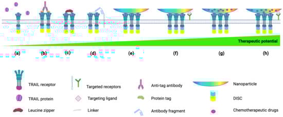 Correlation between TRAIL formulations and anticancer therapeutic potential. (a) RhTRAIL-based therapy, (b) crosslinking TRAIL monomers through an anti-tag antibody or (c) protein fusions facilitating TRAIL oligomerization (i.e., leucine zipper-TRAIL) [5,133]. (d) Conjugation of antibody fragment to TRAIL using a linker (i.e., scFv425) [86] to target tumor cells. (e) Conjugation of TRAIL to nanoparticles (NPs) to mimic membrane-bound TRAIL, (f) additional functionalization of the NPs with antibodies or other molecules to target cancer cells or tumor sites. (g) Encapsulation of chemotherapeutic agents into TRAIL-functionalized NPs and (h) further modification of NPs surface with molecules or antibodies for active targeting. Figure was generated with BioRender.