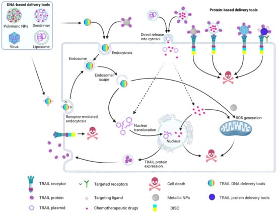 Schematic representation of using nanoparticles to improve TRAIL efficacy. TRAIL DNA-based delivery tools: Uptake by tumor cells via either passive- or active (receptor-mediated) endocytosis. The endocytosed NPs escape from the endosome and release the encapsulated TRAIL gene into the cytosol, which then translocates to the nucleus. After transcription and translation, soluble TRAIL is released into the tumor microenvironment, where it can interact with its receptors (death receptor (DR)4 and 5 to induce apoptosis. Alternatively, TRAIL gene-encapsulating liposomes can fuse with the cell membrane and directly release the TRAIL gene into the cytosol. Dendrimers and polymeric NPs can co-deliver TRAIL gene and chemotherapeutic reagents, resulting in DNA damage thus amplifying the TRAIL-induced cell death signals. The figure was generated with BioRender.