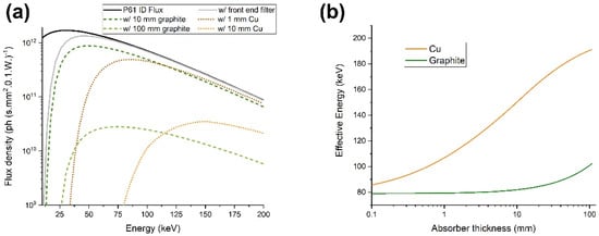 (a) Simulated energy spectrum at sample position, at Beamline P61A. Values considering a frontend filter and different thicknesses of absorber materials are also shown. (b) Effective energy (weighted average of attenuated spectrum) as a function of absorber thickness, calculated for Cu and graphite.