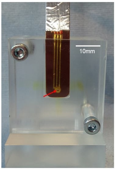 EPI-50 silicon strip detector embedded in a PMMA phantom in face-on view. The arrow indicates the approximate position of the sensitive area. The brownish staining in the PMMA was caused by a short exposure of the phantom to the X-ray beam.