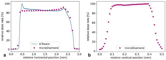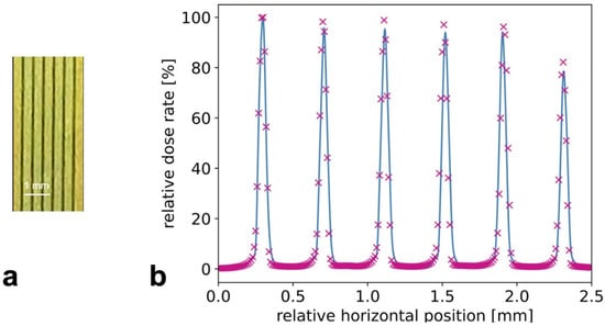 Microbeams obtained at the beamline P61A. Recorded on an HD-V2 Gafchromic™ film (a) and relative dose rate measured with the X-Tream (blue) and PTW microDiamond (magenta) (b).