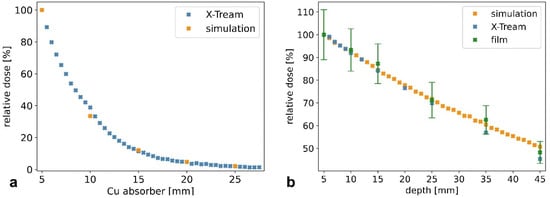 The analysis of the dose-rate dependence for several Cu filters is summarized in Figure 5. We achieved a reduction of 67% with respect to the initial beam filtration of 5 mm by using an additional Cu thickness of 5 mm. This experimental result was confirmed by having a very good agreement with the Monte Carlo simulations (see Figure 6). The simulated incident X-ray spectrum is therefore suitable for these preliminary studies. This is confirmed by the good agreement between measured and simulated depth-dose curves in PMMA, as shown exemplarily in Figure 6 for a Cu filtration of 10 mm.