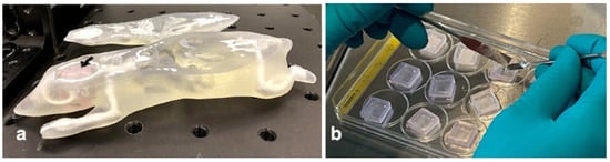With a reduction of the number of animal studies in mind, a mouse phantom was produced in an additive manufacturing process from tissue-equivalent materials [38]. Specifically for work at beamline P61A, a 6 mm × 13 mm wide and 13 mm deep vertical slit was created to insert an approx. 5 × 10 mm sample generated in a 3D bioprinting technique from malignant tumor cells. The bioprinting technique has been previously described [29]. 3D bioprinted material can be reproducibly custom shaped during the printing process, to fit the requirements of each individual experiment. In order to avoid contamination of the phantom or the beamline with biological material, a re-usable case was printed using a 3D printer (Form 2, Formlabs, Somerville, MA, USA) from biocompatible material (BioMed Clear Resin, Formlabs, Somerville, MA, USA). At the cell culture work bench under sterile conditions, the bioprinted material is placed into this case, which in turn is inserted into the mouse phantom (Figure 7).
